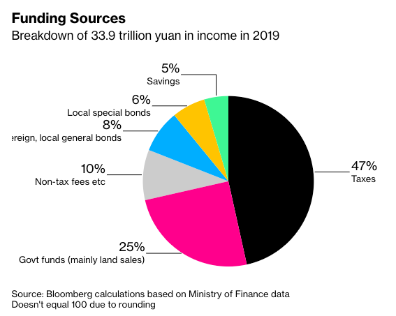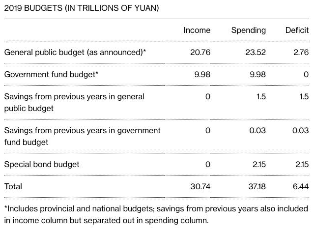 Есть local bond budget, в котором китайское правительство раздает деньги местным бизнесам в виде выпуска специальных облигаций, и еще есть несколько каких-то небольших бюджетов. В одной из статей Bloomberg приводит такую вот оценку китайского бюджета: