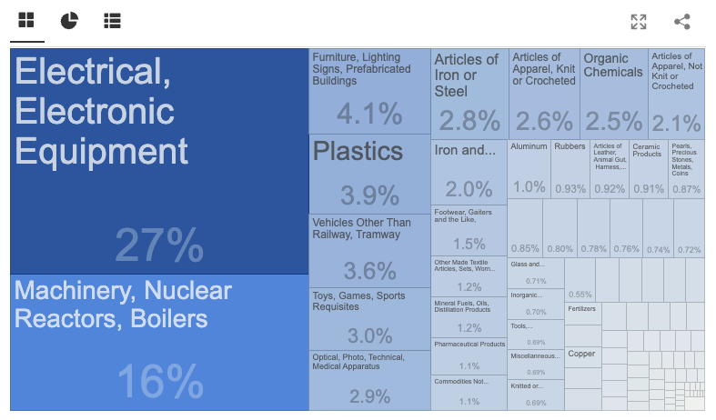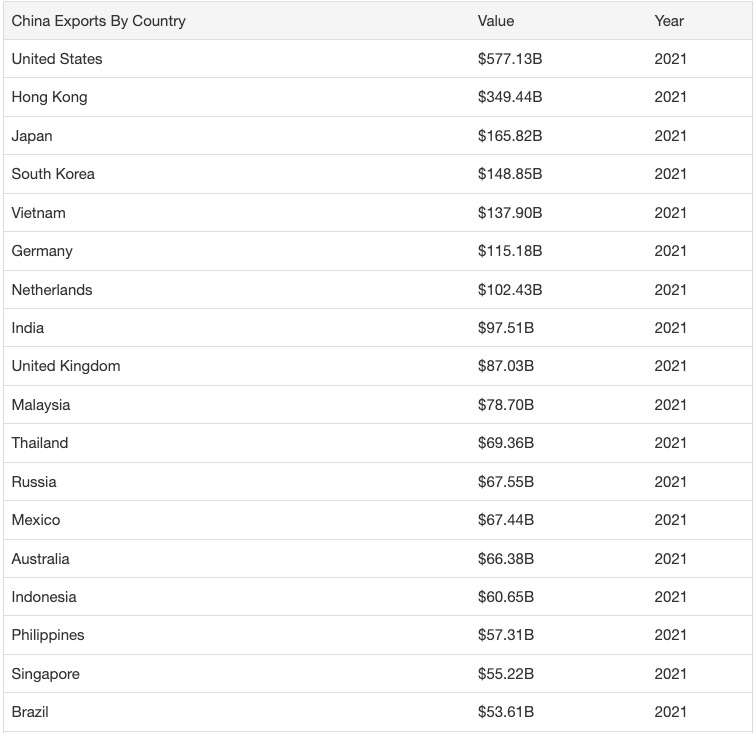 Для начала надо рассчитать долю предполагаемых прямых “врагов” в структуре экспорта Китая. Данные за 2022 еще не везде доступны, потому за основу будут взяты данные 2021: