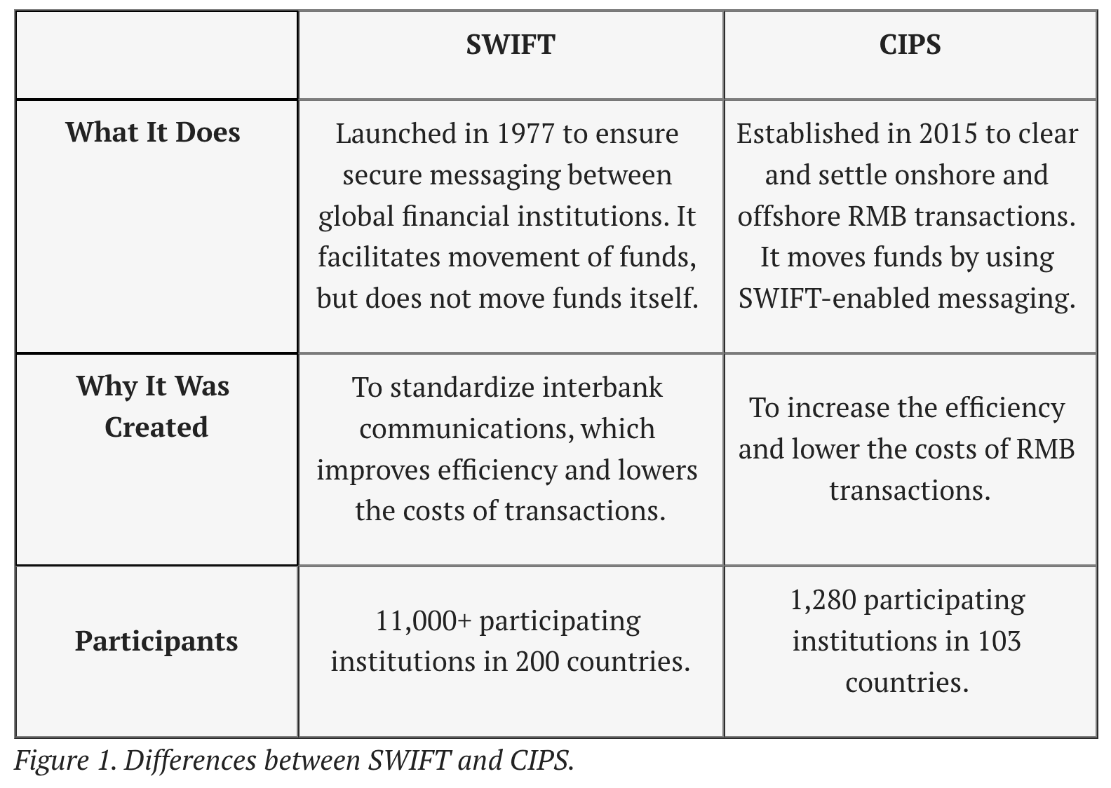 Также для платежей в юанях Китай создал альтернативу SWIFT – Cross-Border Interbank Payment System (CIPS), которая позволяет им вести торговлю с другими странами и делать “transaction settlement” без обращения к SWIFT. CIPS доступен из более чем 100 стран мира, включая например Лондон, и в нем зарегистрировано около 11% всех крупнейших мировых банков и финансовых организаций (1200 из 11000). Именно через CIPS Россия и Иран торгуют с Китаем, будучи отключенными от SWIFT.
