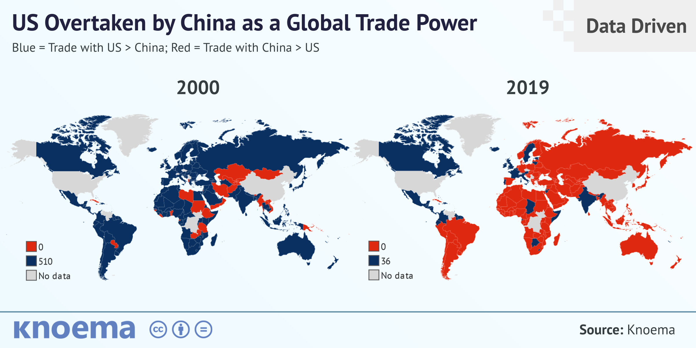 Говоря про потенциальные санкции и их обход с помощью третьих стран, важно проговорить про роль и влияние Китая и США в мировой торговле и экономике. Доминирование США в сфере высоких технологий, полупроводников, ПО и тд не поддается сомнению, но Китай – основной торговый партнер мира. Если мы откроем статистику Всемирного Банка, то Китай будет числится главным торговым партнером сразу для 120 стран мира, в то время как США – только для 20. Десятки стран критически зависят от торговли с Китаем. Фейсбук и Майкрософт это, без сомнений, круто, но обувь, лекарства, удобрения, оборудование, базовая бытовая электроника важней на коротком сроке.